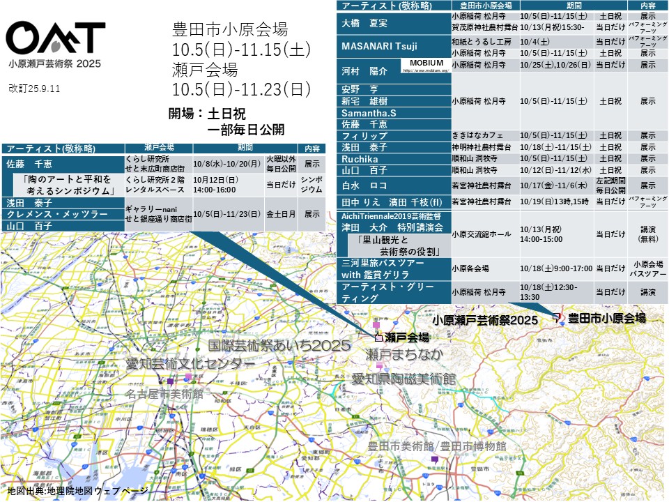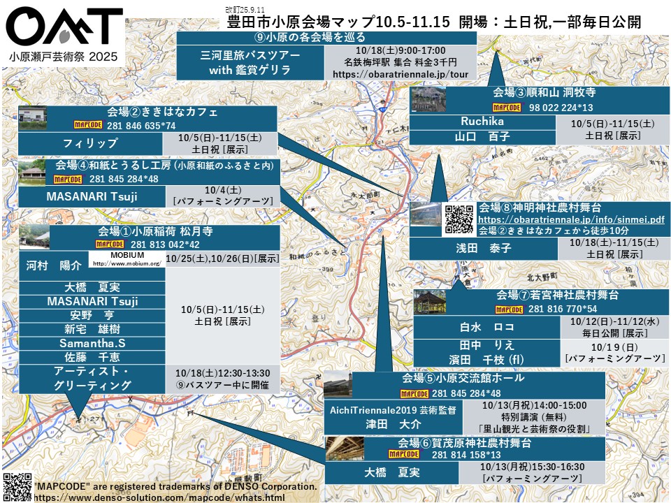 | 大橋 夏実 プロフィール | 1. 豊田市小原会場 賀茂原神社農村舞台 10/13(月・祝日) 15:30から16:30 パフォーミングアーツ ※津田大介氏特別講演会の終了後開催,小原交流館から小原観光協会へ移動し,同駐車場から徒歩7分 2. 豊田市小原会場 松月寺 小原稲荷 10/5(日)から11/15(土)の土曜日・日曜日・祝日 10:00から16:00 |