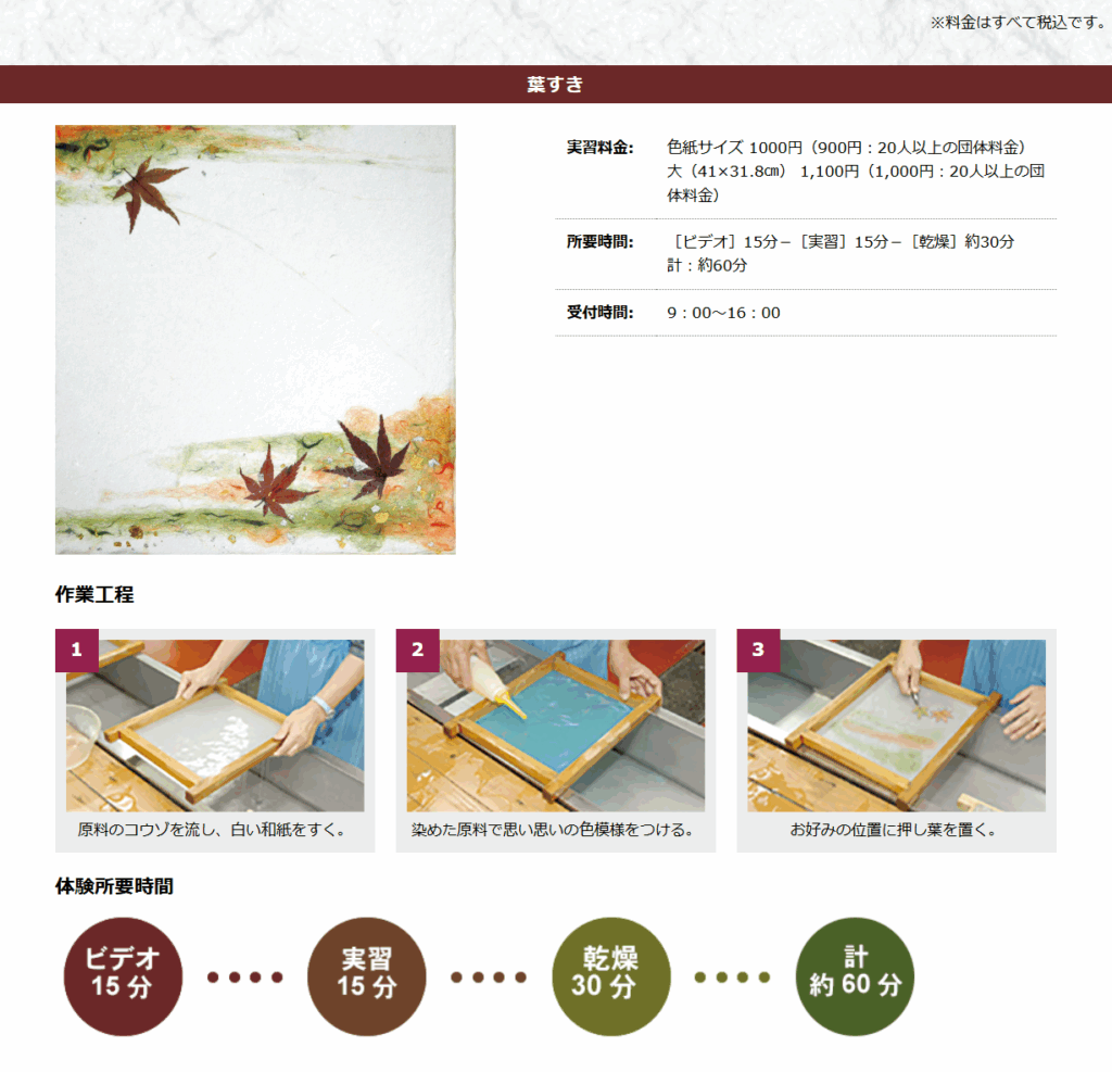 小学生から楽しめる和紙づくり体験と作品鑑賞の組合せです。